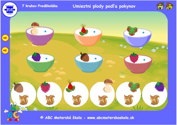 Dieťa určuje a umiestňuje predmety podľa pokynov. Vkladá obrázky (plody) do misiek podľa poradia a polohy. Roztriedi objekty v skupine podľa pokynov. Rozvíja si slovnú zásobu. Poznáva základné a zmiešané farby. Vlastnými slovami vysvetlí význam slov, ktoré pozná. Plní úlohy podľa pokynov.