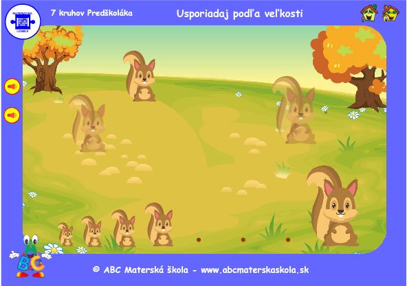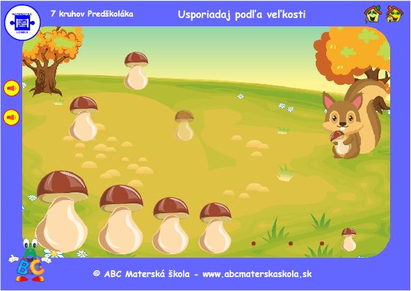 Dieťa porovnáva a usporiada predmety podľa veľkosti. Ukladá obrázky (hríby, veveričky) podľa veľkosti od najmenšieho po najväčší a od najväčšieho po najmenší.