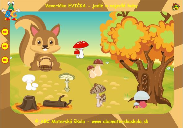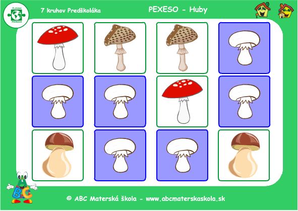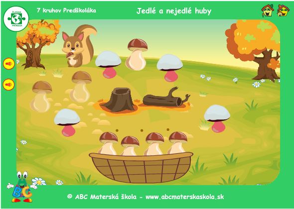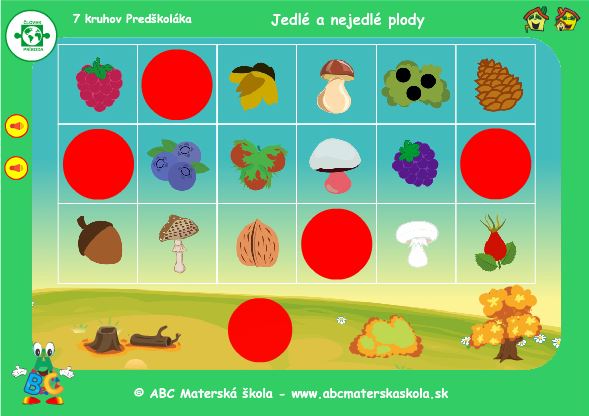 Dieťa pomenuje a určuje jedlé a nejedlé huby, jedlé a nejedlé plody. Hľadá rovnaké obrázky a určuje ich polohu a poradie.