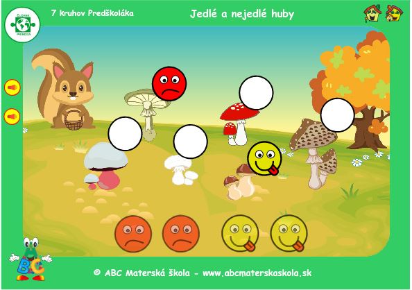 Dieťa pomenuje a určuje jedlé a nejedlé huby, jedlé a nejedlé plody. Priraďuje smajlíkov podľa farby k jedlým a nejedlým plodom.