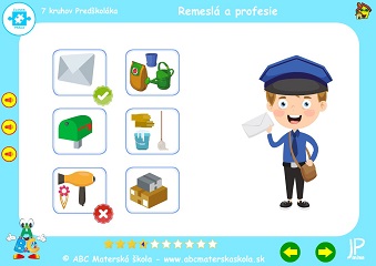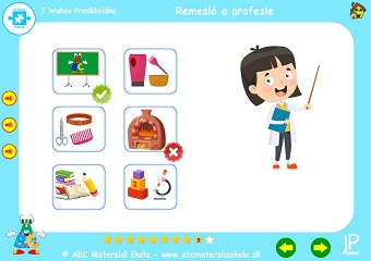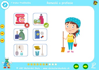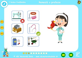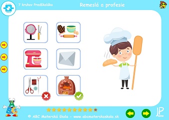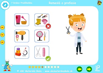 Súbor hier Remeslá a profesie – 1. až 10. hra – Porozprávaj, kto je na obrázku a čo drží v ruke. Klikaj postupne na obrázky povolaní a pomenuj predmety, s ktorými každý pracuje. Porozprávaj, čo kto robí a kde pracuje. Hľadaj a vyber pomôcky, ktoré používajú pri svojej práci. Pomenuj ostatné predmety a skús porozmýšľať, kto ich používa pri svojej práci.