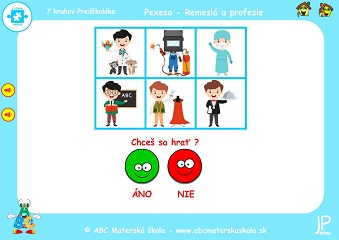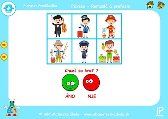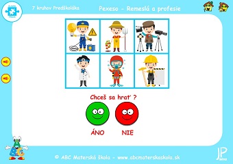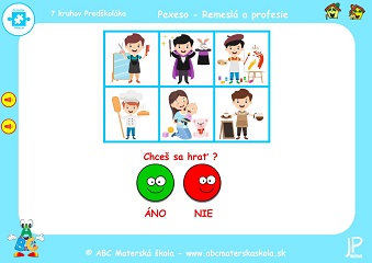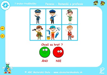 Hry PEXESO Remeslá a profesie – 11. až 18. hra – Pomenuj povolania a skús si ich zapamätať. Klikaj na kartičky a hľadaj rovnaké obrázky. Porozprávaj, čo kto robí a čo potrebuje pri svojej práci.