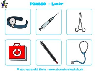 Strana    1 Pexeso Lekár - farebná predloha - Pomenuj profesiu a pracovné náradie lekára. Vytlač 2x a zahraj sa hru Pexeso. Urči polohu a poradie obrázkov.