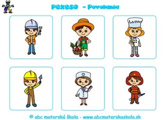 Dieťa poznáva vybrané profesie. Určuje polohu kartičiek ( vľavo hore, vpravo hore, v strede hore, vľavo dole, vpravo dole, v strede dole) a poradie (prvá, druhá, tretia...). Vyfarbuje a vystrihuje kartičky podľa farebnej predlohy. Zahrá sa hru Pexeso a hľadá rovnaké obrázky. Rozvíja si aktívnu slovnú zásobu, výtvarné a pracovné zručnosti, jemnú motoriku, farebné cítenie, logické myslenie, pamäť, priestorovú orientáciu...
