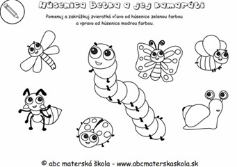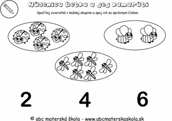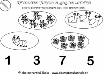 Húsenica Betka a jej kamaráti - Pracovné listy: Pomenuj a spočítaj zvieratká, pospájaj čísla v poradí, priraď správne číslo, porovnaj počet v skupine, vyfarbi obrázky a urči polohu objektu.