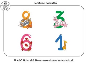 Dieťa poznáva niektoré zvieratá a živočíchy. Zisťuje počet objektov v skupine a rieši jednoduché úlohy súvisiacich s počtom. Určí počítaním po jednej počet objektov v skupine. Pre dve skupiny určí, kde je viac, kde je menej alebo rovnako veľa predmetov podľa zisteného počtu v skupinách (do 10 prvkov v skupine). Priraďuje obrázky podľa počtu. Vlastnými slovami vysvetlí význam slov, ktoré pozná. Rozvíja si slovnú zásobu, matematické predstavy, logické myslenie, pracovné a výtvarné schopnosti a zručnosti. Na základe farebnej predlohy vyfarbuje, vystrihuje a nalepuje čísla v pracovnom zošite Počítame zvieratká.